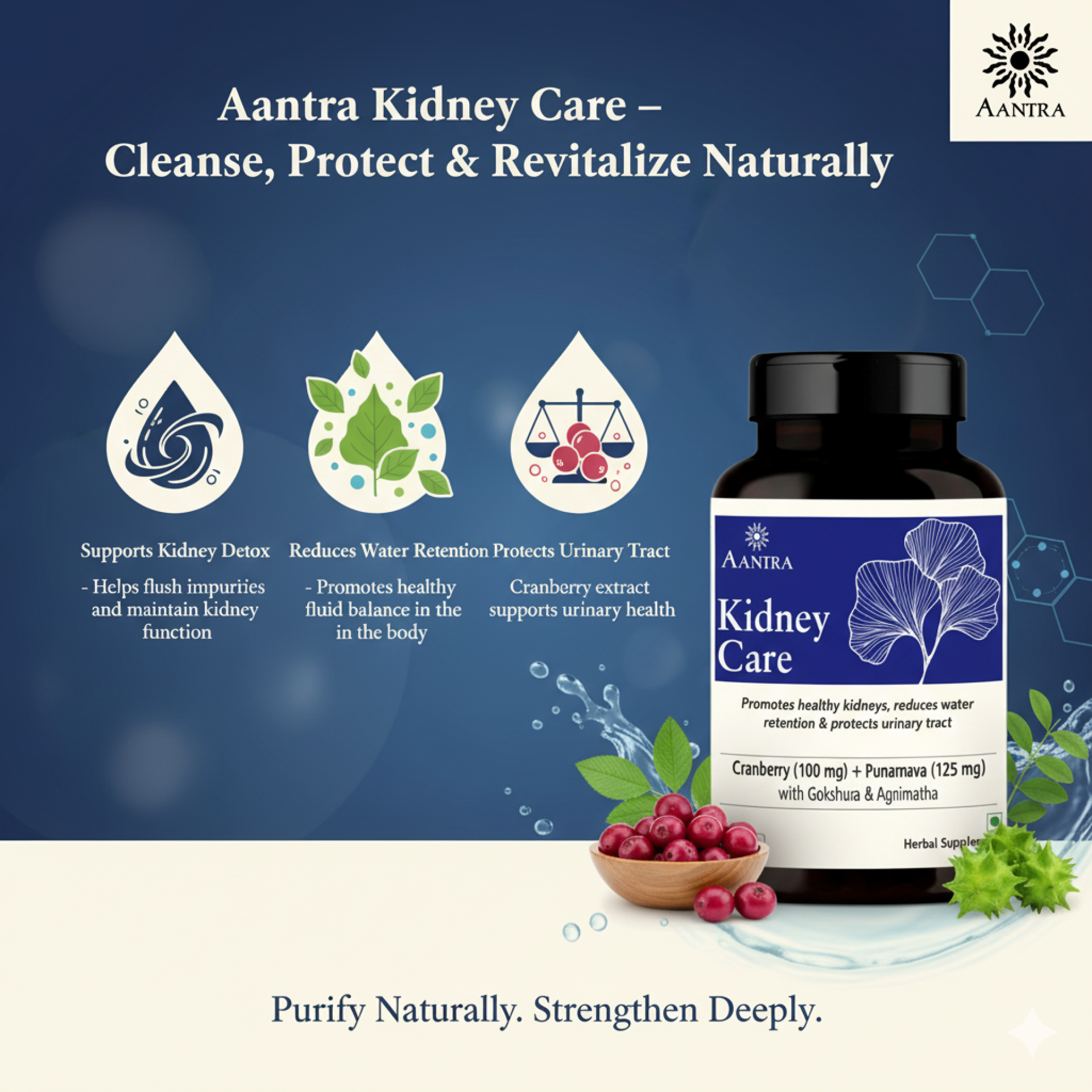 A premium kidney and urinary wellness supplement with Cranberry, Punarnava, Gokshura, Mulethi, and Agnimatha to support detox, fluid balance, and urinary comfort.