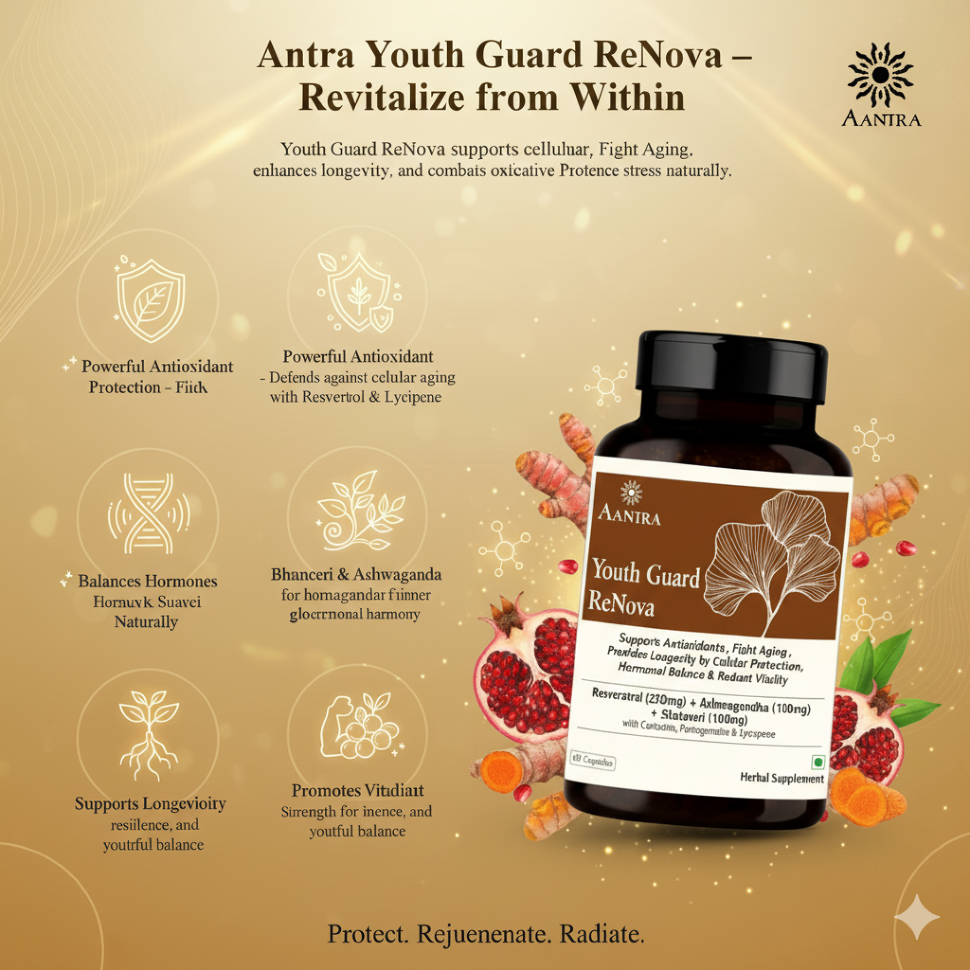 “Aging is more than wrinkles — it’s about oxidative stress, hormonal decline, and cellular wear. Aantra Youth Guard ReNova is designed to work on multiple aging pathways: Ashwagandha reduces stress, Shatavari supports hormones, Turmeric and Resveratrol fight inflammation and DNA damage, while Pomegranate, Lycopene, and Beta-Carotene provide deep antioxidant protection. With added Trikatu & Piperine for bioavailability and Mulethi + Triphala for gut-liver detox, ReNova offers inside-out support for vitality, skin glow, and longevity.”